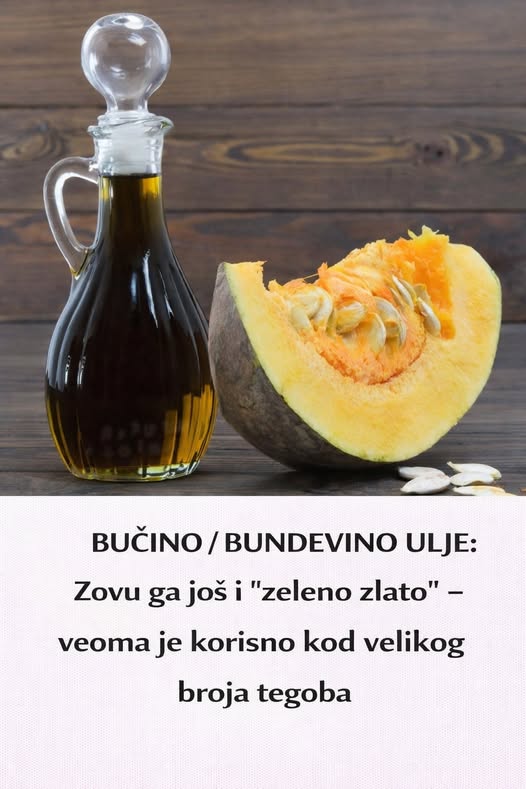 Bučino ulje je veoma zdravo. U nastavku teksta doznajte koje su blagodati bučinog ulja. Bučino ulje već se dugo koristi u prehrani i narodnoj medicini zbog svojih vrijednih sastojaka i blagotvornog djelovanja na organizam. Dobiva se prešanjem sjemenki bundeve, a posebno je cijenjeno kada je hladno prešano jer na taj način zadržava najveći dio svojih hranjivih tvari. Tamnozelena boja i karakterističan orašasti okus čine ga prepoznatljivim dodatkom mnogim jelima, ali njegova vrijednost nije samo u okusu nego i u utjecaju na zdravlje.