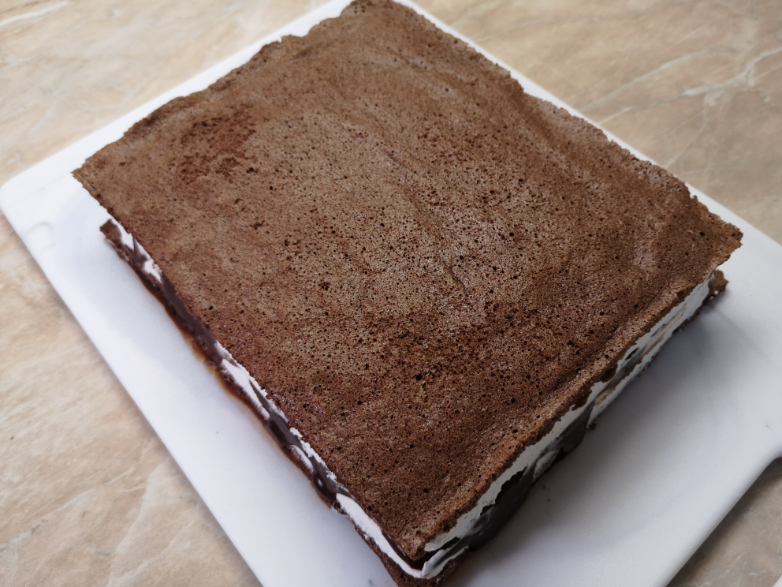 Preko fila pažljivo stavite drugi sloj biskvita. Blago pritisnite rukama kako bi se slojevi povezali, ali nemojte preterivati da fil ne izađe sa strane.