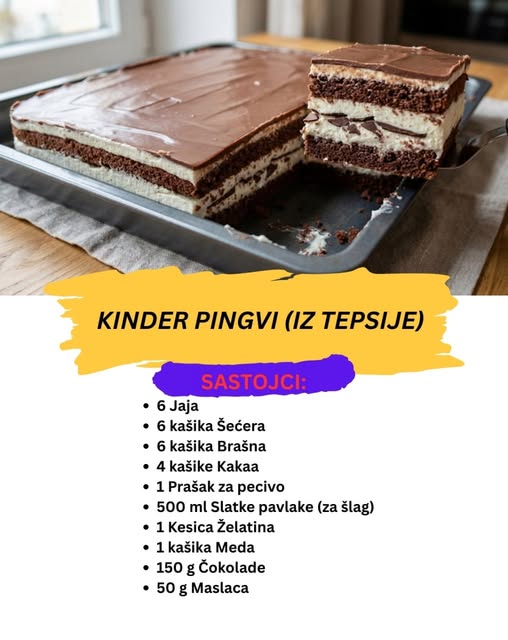 Kolač kojeg će svi obožavati. U nastavku teksta donosimo vam recept. Ako tražite kolač koji će izazvati pravo oduševljenje za stolom, ovaj domaći Kinder Pingui je pun pogodak. Mekan kakao biskvit, lagana bela krema i čokoladna glazura zajedno stvaraju desert koji podseća na popularnu kupovnu verziju, ali sa još bogatijim ukusom. Posebno je praktičan jer se pravi u tepsiji, pa ga lako možete iseći na više porcija i poslužiti kada god poželite.