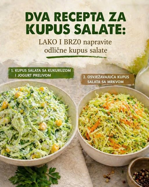 Ako ste ljubitelji kupusa onda za vas imamo dvije verzije salata koje će vas oduševiti. U nastavku teksta donosimo vam recept. Kupus salata spada među ona jela koja se pripremaju brzo, a uvijek donesu svježinu na sto. Osim što je jednostavna za napraviti, lako se prilagođava različitim ukusima i jelima uz koja se poslužuje. Bilo da tražite lagan dodatak uz ručak ili brz obrok koji ne zahtijeva mnogo sastojaka, kupus je uvijek dobar izbor. Njegova hrskava tekstura i blago slatkast okus čine ga odličnom bazom za razne kombinacije.