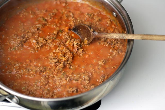 Kada se mlijeko i vino sjedine s mesom i sve lagano proključa, dodajte konzervirani paradajz. U nedostatku svježeg paradajza, konzervirane rajčice su sasvim dobar izbor, naročito sorte poput San Marzano koje imaju prirodnu slatkoću i manju kiselost.