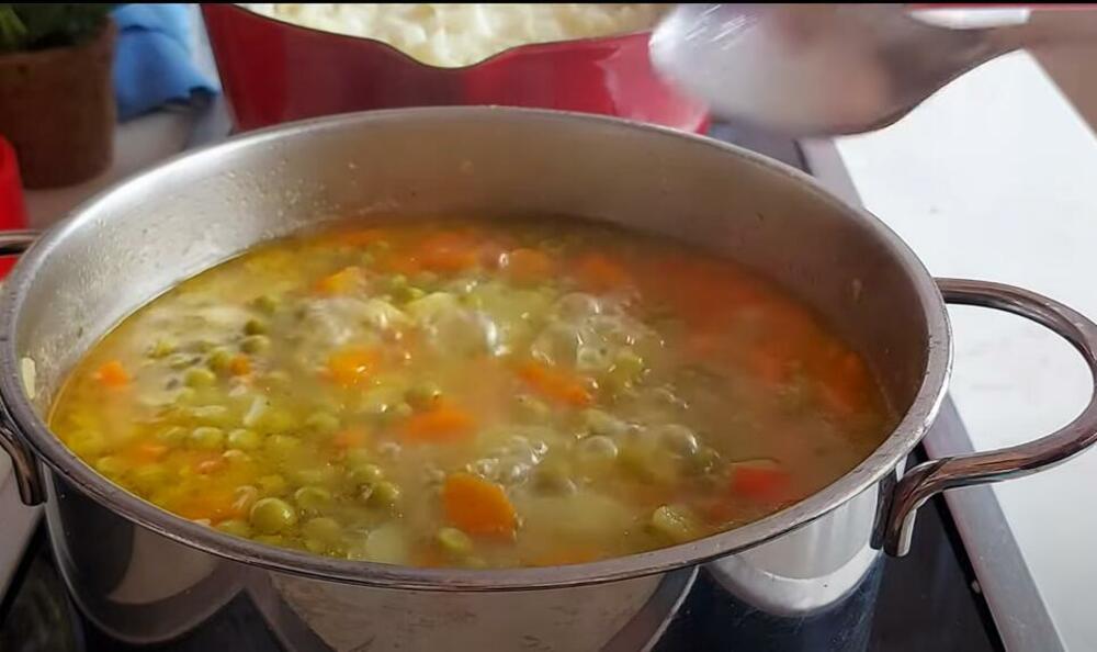 Kada tečnost provri, vrijeme je za grašak. Ako koristite zamrznuti, ne morate ga prethodno odmrzavati. Ubacite ga direktno u šerpu i dobro promiješajte. Nakon što ponovo proključa, smanjite temperaturu na laganu i ostavite da se sve polako kuva.
