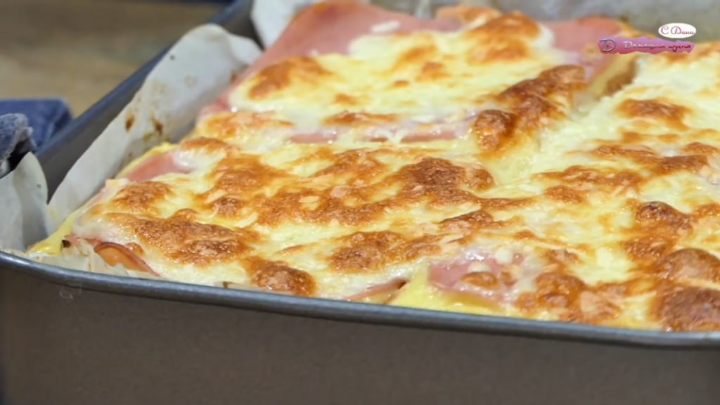 Vatrostalni pleh se premaže s malo ulja kako se hljeb ne bi zalijepio tokom pečenja. Kriške hljeba se zatim umaču u pripremljenu smjesu i slažu u pleh, jednu pored druge. Na hljeb se rasporedi šunka, a preko svega se prelije ostatak smjese.