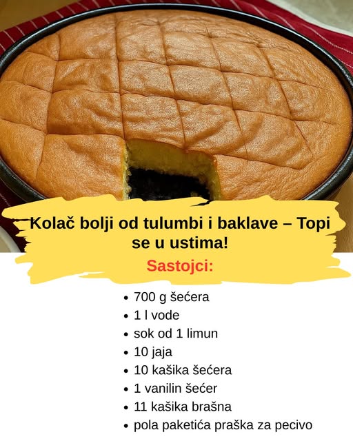 Kolač koji se topi u ustima. U nastavku teksta donosimo vam recept. Ako ste ikada mislili da nema boljeg deserta od tulumbi ili baklave, ovaj kolač će vam dokazati suprotno. Njegova tekstura je nevjerovatno mekana, a šerbet savršeno upija svaku sočnu sloj tijesta, dajući mu bogat, sladak okus koji se topi u ustima. Ono što je najbolje – priprema je jednostavna, ali efekat na kraju je spektakularan, savršen za posebne prilike ili kada jednostavno želite da se počastite nečim slatkim i domaćim.