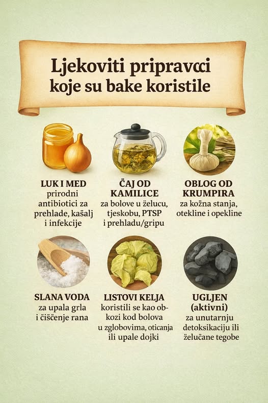 Ljekoviti pripravci koji su se koristili i naši predci. O kojim pripravcima je riječ doznajte u nastavku teksta. U mnogim domaćinstvima prirodni pripravci imaju posebno mjesto. Iako danas postoje brojni lijekovi dostupni u apotekama, ljudi se i dalje često okreću jednostavnim rješenjima koja su koristile i prethodne generacije. Razlog tome nije samo navika, već i dostupnost sastojaka, jednostavna priprema i osjećaj sigurnosti koji dolazi uz poznate metode. Luk, med, kamilica, krumpir, sol, kelj i aktivni ugljen nalaze se u gotovo svakoj kuhinji, a njihova primjena može biti korisna kod blažih tegoba. Važno je naglasiti da se ovi pripravci koriste kao pomoć, posebno kod lakših stanja, dok se kod ozbiljnijih zdravstvenih problema uvijek treba obratiti ljekaru.