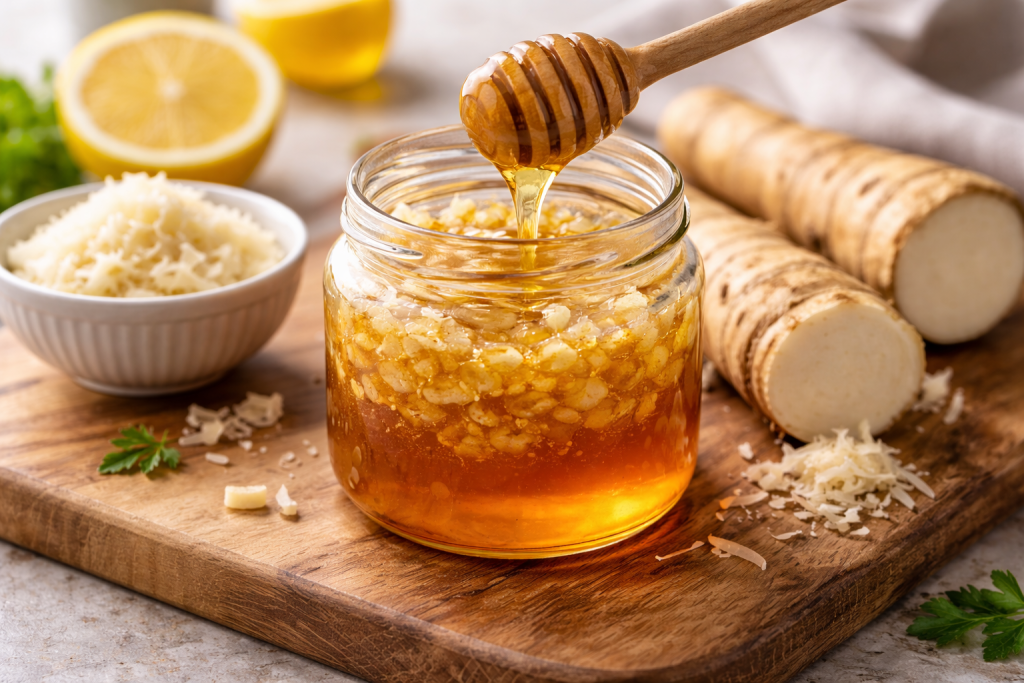 Za ublažavanje kašlja često se koristi jednostavna kombinacija rena i meda. Dovoljno je pomiješati jednu kašičicu svježe narendanog rena s istom količinom meda i uzimati ujutru na prazan želudac. Ova kombinacija djeluje umirujuće na grlo i može pomoći u smanjenju nadražaja koji izaziva kašalj.