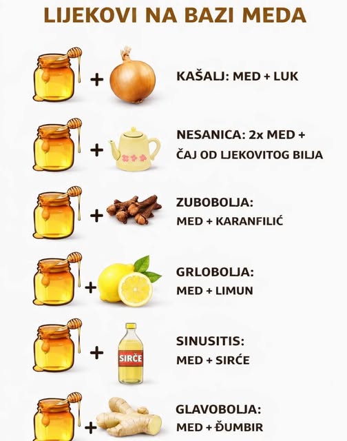 U nastavku su opisane neke od najčešćih narodnih kombinacija meda s drugim sastojcima, koje se koriste u različitim situacijama svakodnevnog života. One se temelje na iskustvu i navikama, a ne na zamjeni za stručnu medicinsku pomoć.
