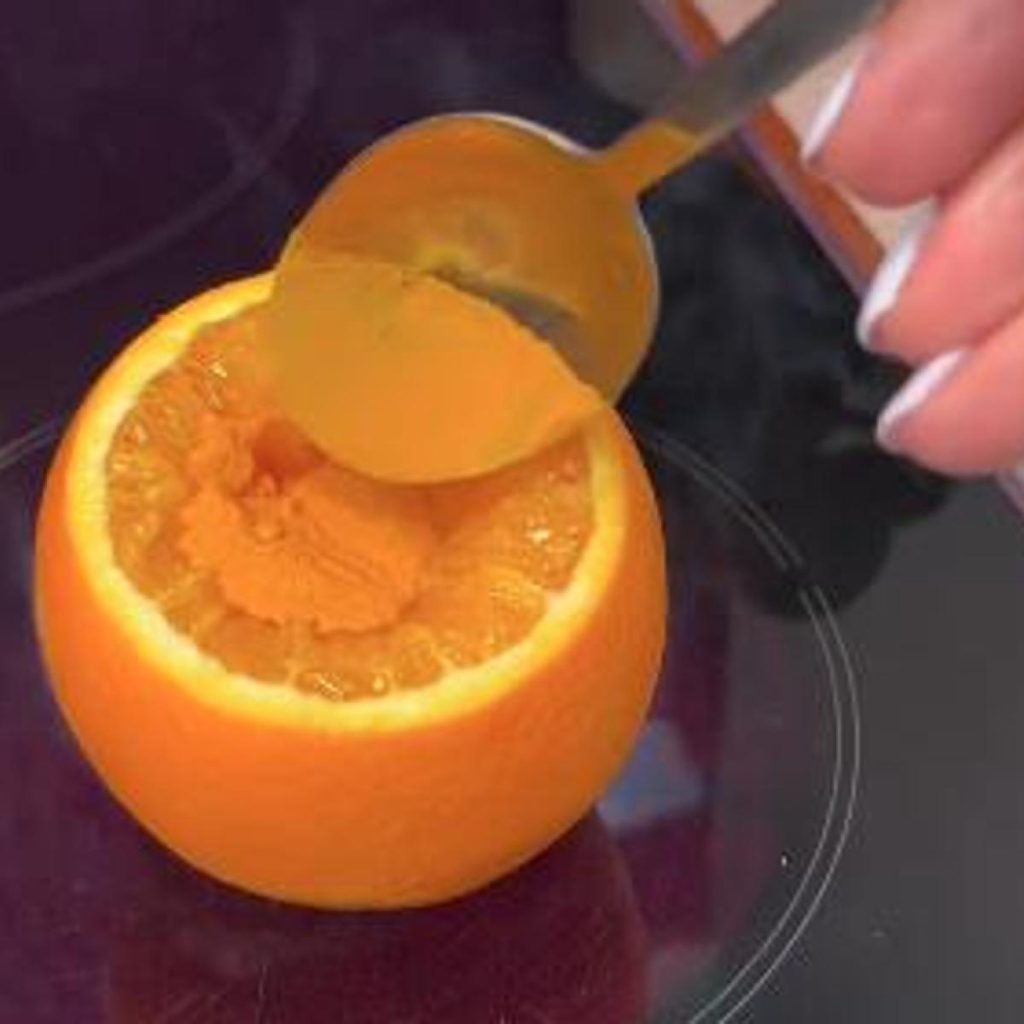 Priprema počinje od same pomorandže. Prvo je potrebno dobro je oprati, a zatim je pažljivo presjeći tako da se ukloni gornji dio, kao da se pravi mali “poklopac”. Nakon toga se unutrašnjost pomorandže lagano izdubi, ali ne do kraja, kako bi se zadržao njen oblik i sok.