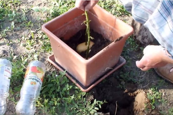Kada je rupa spremna, pažljivo ubacite reznicu u krompir. Donji dio stabljike treba da bude potpuno uvučen u njega.
