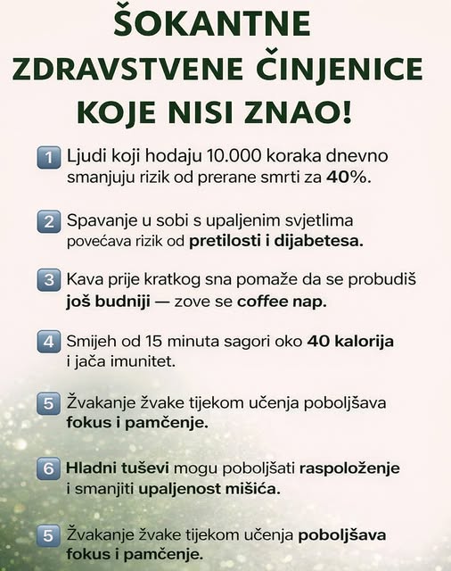 Ove zdravstvene činjenice sigurno niste znali. O kojim činjenicama je riječ doznajte u nastavku teksta. Savjeti o zdravlju danas dolaze sa svih strana. Društvene mreže, portali i influenseri svakodnevno nude brza rješenja, često predstavljena kao “tajne” koje će promijeniti život preko noći. Iako mnoge tvrdnje zvuče pretjerano ili čak nevjerovatno, dio njih ima čvrsto uporište u nauci. Ljudsko tijelo reaguje na sitne promjene u svakodnevnim navikama mnogo snažnije nego što većina ljudi misli. U nastavku su predstavljene provjerene činjenice koje na prvi pogled djeluju neobično, ali iza sebe imaju jasna objašnjenja i praktičnu primjenu u svakodnevnom životu.