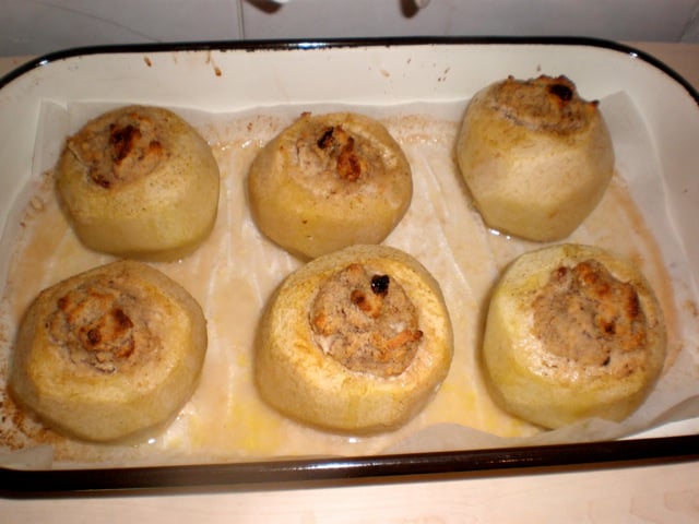 Napunite svaku jabuku do vrha ovom smjesom i posložite ih u posudu za pečenje. Pazite da se jabuke ne pretrpaju kako bi se ravnomjerno ispekle. Stavite ih u prethodno zagrijanu pećnicu na 180 °C i pecite oko 15 minuta, dok površina ne dobije laganu boju.